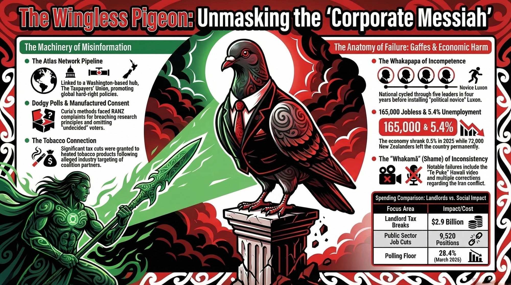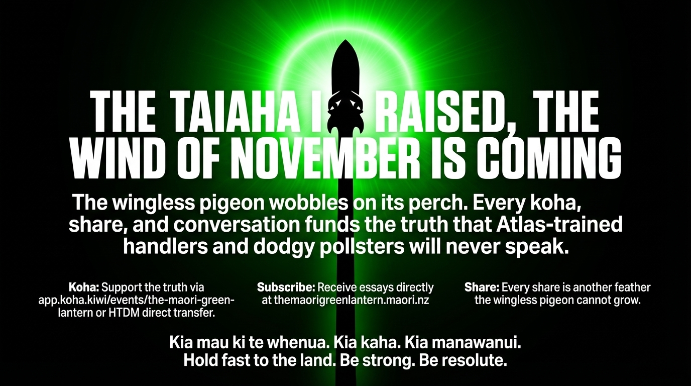 Every koha signals that whānau are ready to fund the truth that wingless pigeons, their Atlas-trained handlers, and their dodgy pollsters will never speak. It signals that rangatiratanga includes the power to fund our own voices — the voices that name the gaffes, dissect the Taxpayers' Union's bullshit numbers, trace the whakapapa of cruelty from five failed leaders to Luxon's seven houses to the fish-head queue in Māngere, and hold every "misspeak" to account when the media cycle moves on.