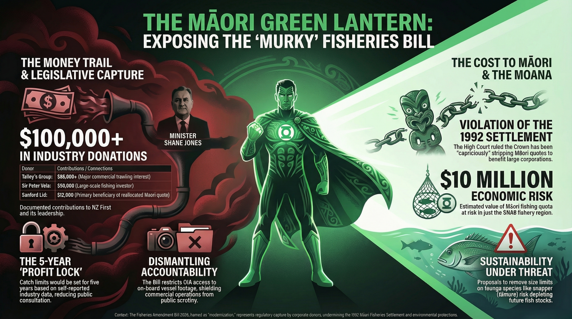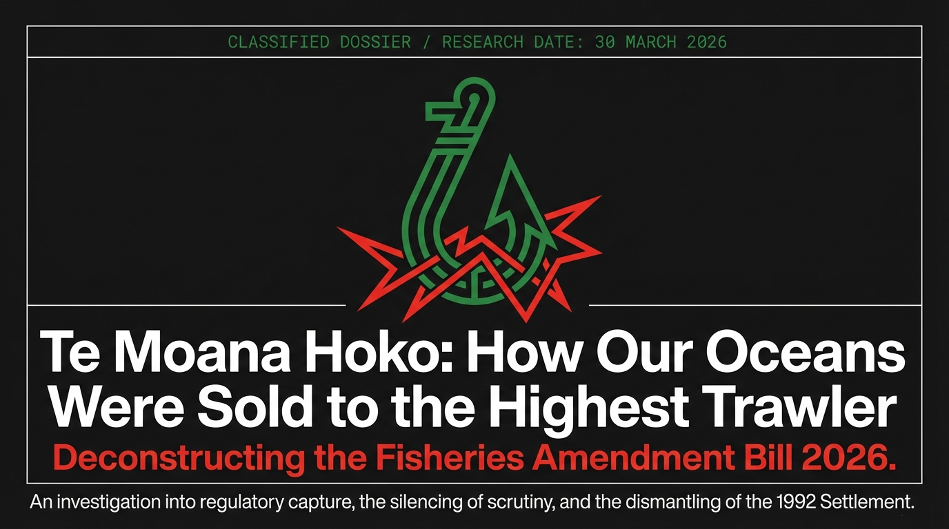 There is a principle in corruption investigations: follow the money, follow the power, follow the silence. The Fisheries Amendment Bill 2026, shepherded through Parliament by NZ First's Shane Jones, fails all three tests catastrophically. The man who was once charged with distributing $800 million in Māori fishing assets — a man who positioned himself as a champion of Māori rangatiratanga — has now become the instrument through which corporate trawlers strip those same assets, silence public scrutiny, and lock in their profits for five years at a time.