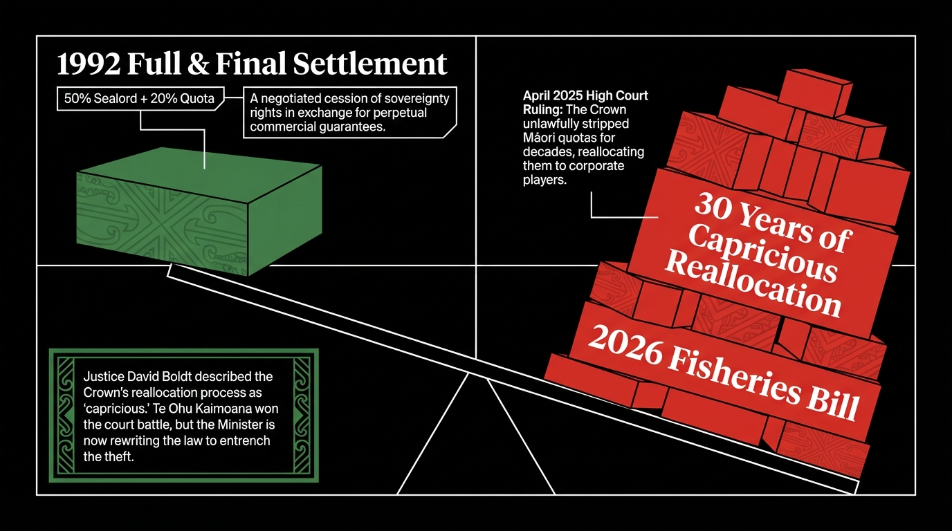 The Crown lied. In April 2025, the High Court ruled that officials had been unlawfully stripping Māori fishing quotas since 1992 and reallocating them to large corporations, primarily Auckland-based Sanford. Justice David Boldt described the process as "capricious." Te Ohu Kaimoana, the Māori fisheries commission, had fought this through the courts. They won. But winning in court means nothing when the Minister of Fisheries is already writing legislation to entrench the very system that robbed them.