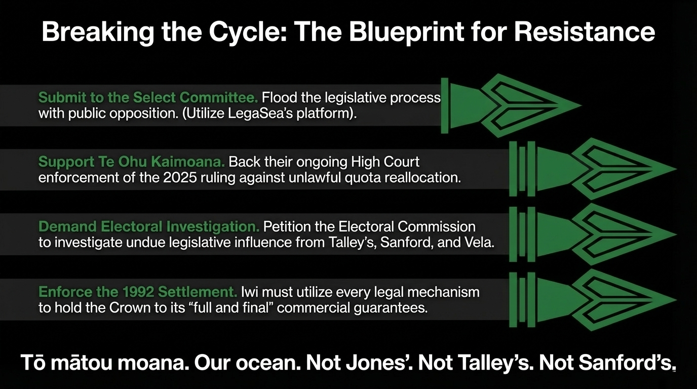 Tō mātou moana. Our ocean. Not Jones'. Not Talley's. Not Sanford's.