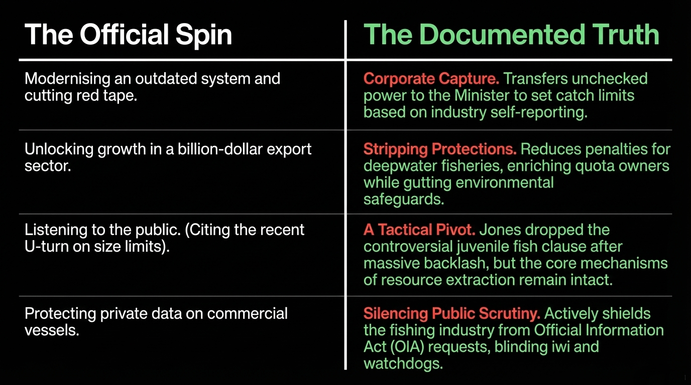 When Jones proposed banning OIA requests for footage from fishing vessels, he wasn't just protecting industry embarrassment. He was dismantling the evidentiary foundation for future Māori quota claims. Without vessel footage, iwi and Te Ohu Kaimoana cannot document the full extent of bycatch, discard, and misreporting that underpins the current unlawful quota allocations. Jones told the NZ Herald: "Does the public have a right to know what's happening in every cow shed tonight? Does the public have a right to know what's happening in your home? No they don't." He compared fishing vessels — publicly licensed to harvest a public resource — to private homes. NZ Herald reported this without challenge. We name it for what it is: the deliberate destruction of accountability infrastructure.