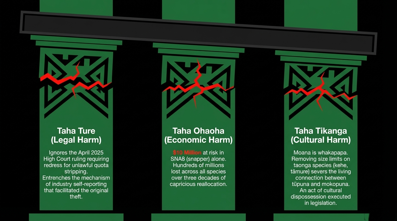 Taha Tikanga (Cultural): Moana is not simply a resource. The relationship between iwi and te moana is foundational — it is whakapapa, it is identity, it is the living connection between tūpuna who fished these waters and mokopuna who should inherit them. The removal of size limits on taonga species like kehe (kingfish) and tāmure (snapper), the silencing of public oversight, the five-year lockdown of catch limits based on industry data — these are not regulatory adjustments. They are acts of cultural dispossession, executed in legislation, funded by donation, signed by a Māori man who should know better.
