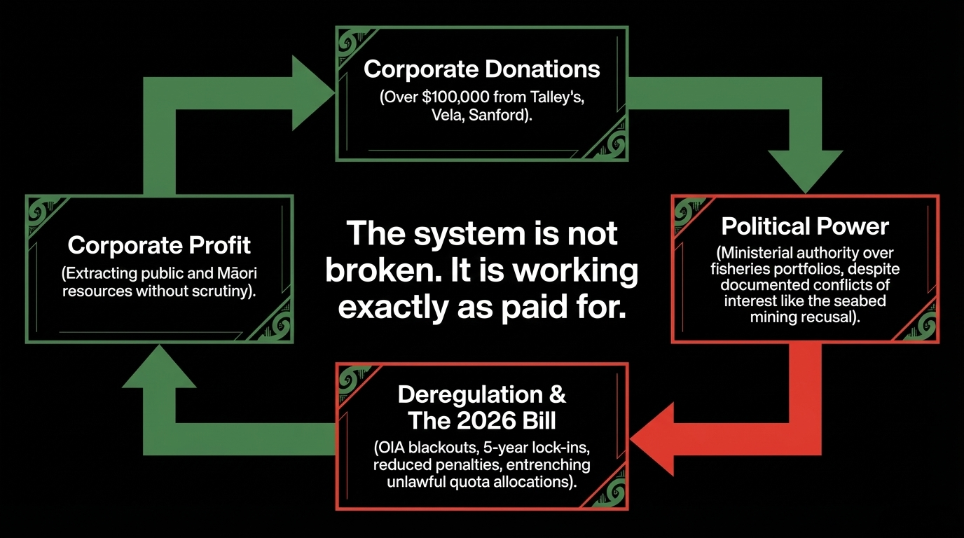 Democracy Project documents that Sanford Ltd donated $12,000 to NZ First in 2024, at the very time it was seeking government approvals for new salmon farms. This is the same Sanford that the High Court found had been the primary beneficiary of unlawfully reallocated Māori quota. They stole Māori quota through regulatory capture — and then donated to the party whose minister is now writing the next round of regulations. The cycle is closed and self-reinforcing.