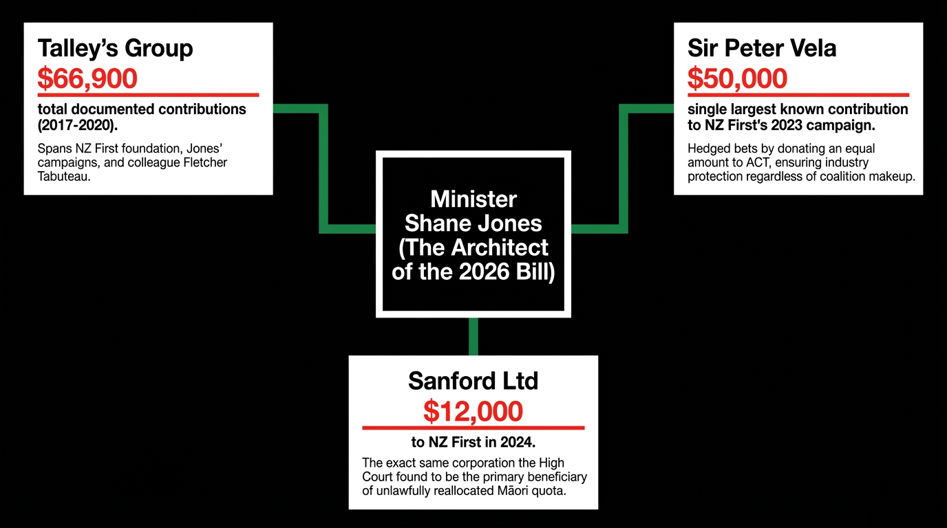 Democracy Project reveals that fishing investor Sir Peter Vela provided the single largest known contribution to NZ First's 2023 campaign — $50,000. Vela gave an equal amount to the ACT Party that same year. This is not political idealism. This is hedging — ensuring that whichever coalition governs, industry interests are protected. It worked. NZ First is in government. Jones is the Minister. The Bill is before Parliament.