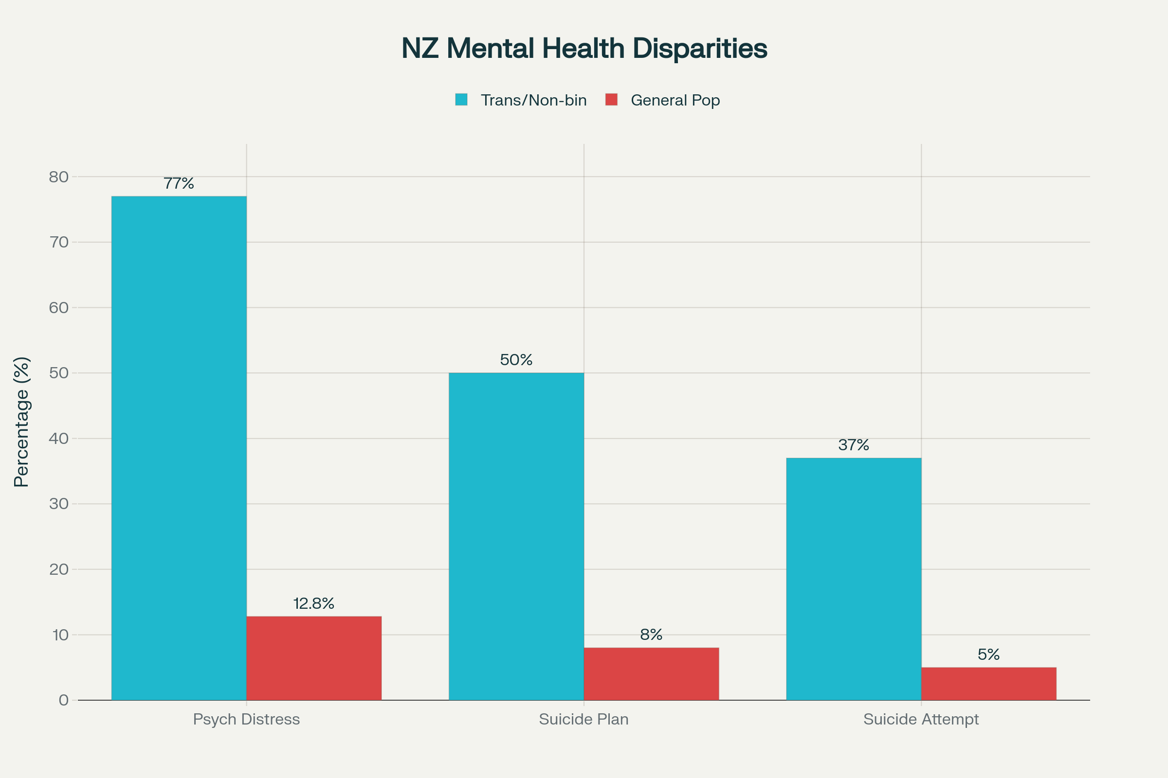 77% of trans and non-binary New Zealanders report high or very high psychological distress, compared to 12.8% of the general population—a rate six times higher, nine times higher among youth. More than half seriously contemplated suicide in the last year. 37% have attempted suicide in their lifetime. Among disabled trans people, nine in ten experienced high or very high psychological distress over a four-week period; two-thirds had deliberately self-harmed in the last 12 months.[19][20]