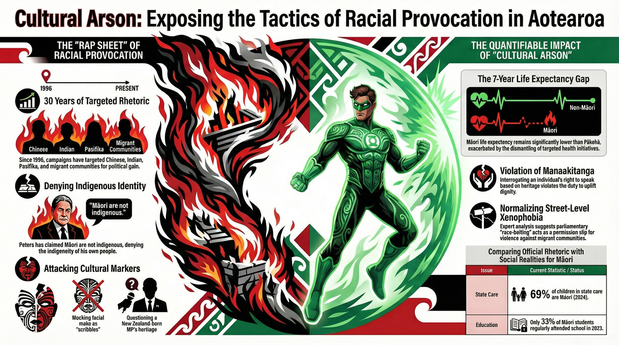 Every time Winston Peters questions a Māori MP's right to speak, every time he calls moko "scribbles," every time he dismisses Aotearoa as illegitimate — the Crown media reports it as "controversy." The Māori Green Lantern calls it what it is: te taiaha pirau — a rotting weapon swung by a traitor against his own people for poll numbers.