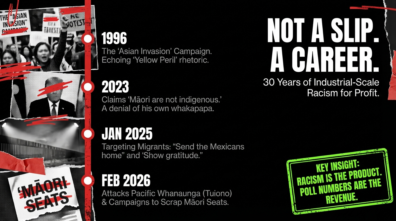 Winston Peters is 80 years old. He has been race-baiting since before some of his voters could read. He has attacked Asians, Indians, Pacific Islanders, Mexicans, Muslims, refugees, and his own Māori people — all from the comfort of taxpayer-funded leather seats, shielded by a Prime Minister too cowardly to say "racist" and a Speaker too deaf to hear it.