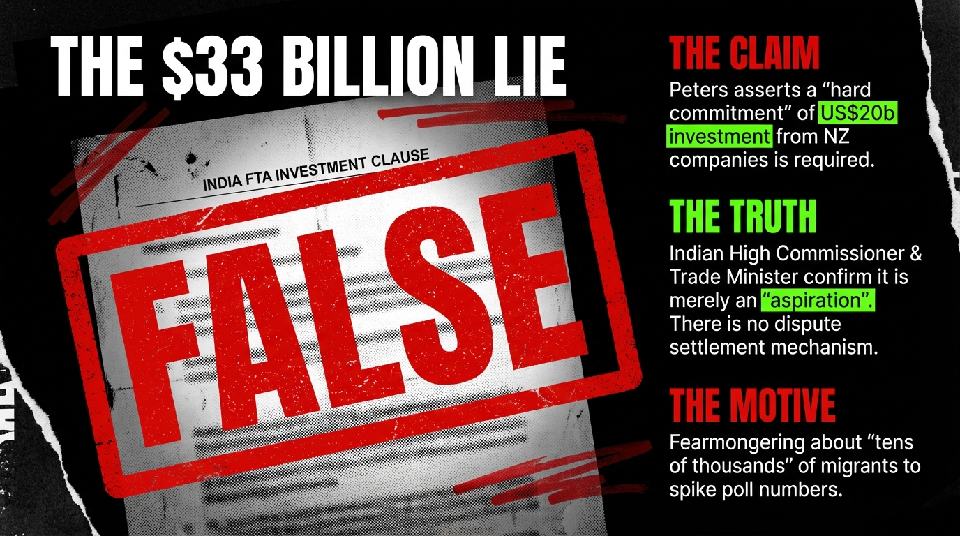 The $33 billion investment clause has become Peters' favourite fearmongering tool. India's outgoing High Commissioner Neeta Bhushan told the NZ Herald it was "an aspiration... something to aspire towards." Trade Minister McClay called it a commitment to "promote investment." But India's Commerce Minister Piyush Goyal described a "clawback measure if investment targets are not met," per Economic Times.
