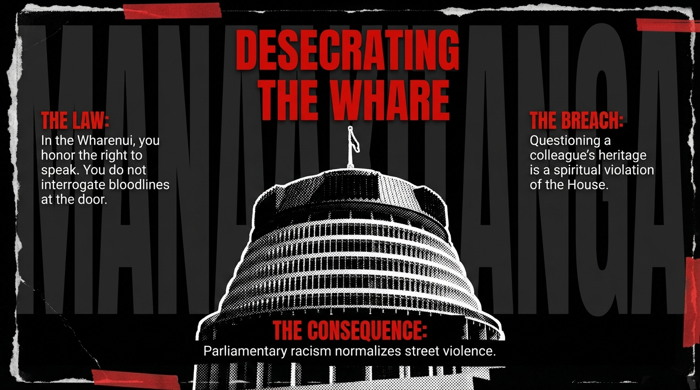 Let the obscenity of that land. A Māori man — of Ngāpuhi descent — interrogated another Māori man's right to speak because of his Pacific heritage. In te ao Māori, this is not "controversy." This is a violation so profound it poisons the wharenui itself. And the Prime Minister sat there like a mannequin in a blue suit, saying absolutely nothing.