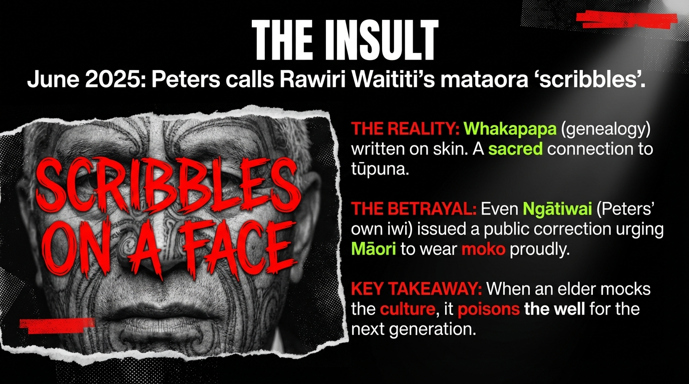 In June 2025, Peters called Rawiri Waititi's mataora — his facial moko — "scribbles on his face" during Parliamentary debate. RNZ reported that Māori academics condemned the remarks. A Māori cultural expert told RNZ that tā moko "represents our history, our whakapapa, our knowledge. It's a key to our very identity and our existence." Peters was forced to apologise by the Speaker — but only after the damage was broadcast nationally.
