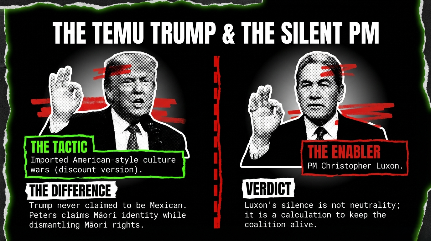 The Greens nailed it: Peters is a "Temu Trump" — a discount-store version of American fascism shipped to the Antipodes with free delivery and no returns policy. As Menéndez March told 1News: Luxon has "failed to show leadership by allowing Peters — 'a Temu Trump' — to spread anti-migrant sentiment."