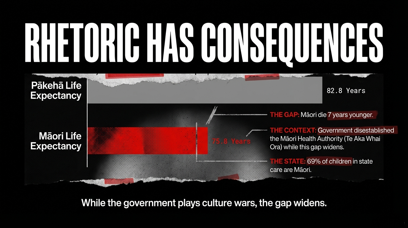 Meanwhile, Māori die 7 years younger. Māori children make up 69% of state care. Only 44% of Māori students regularly attend school. Māori women develop lung cancer 6-8 years earlier. And the government that could address these crises instead dismantles the Māori Health Authority, retroactively strips coastal rights, launches referendums to abolish Māori wards, and lets its senior Minister call moko "scribbles."