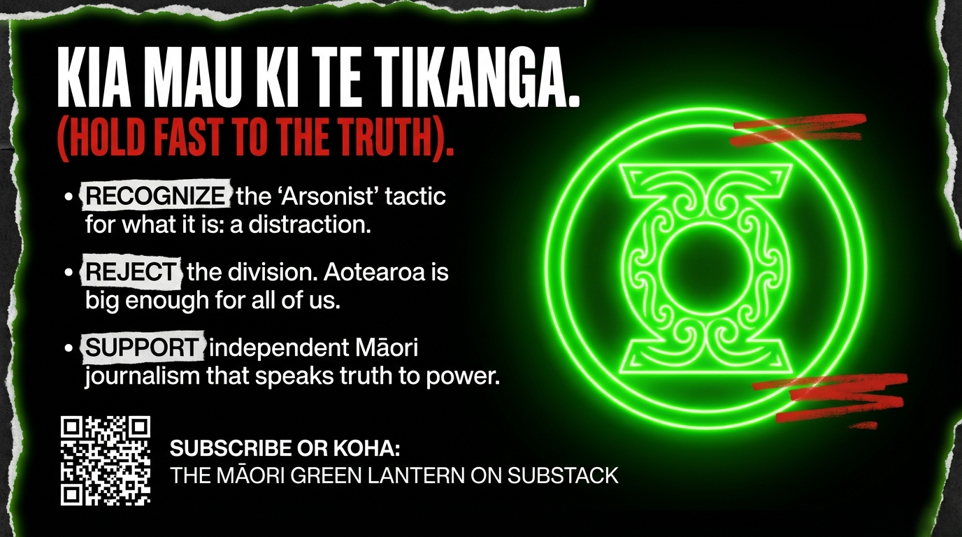 Every koha signals that whānau are ready to fund the journalism that strips the korowai off the coloniser's playbook and exposes the rot in the taiaha. It signals that rangatiratanga includes the power to name the arsonist, quantify the fire, and fund our own truth tellers — because the government that should protect Māori rights is the same government dismantling them.