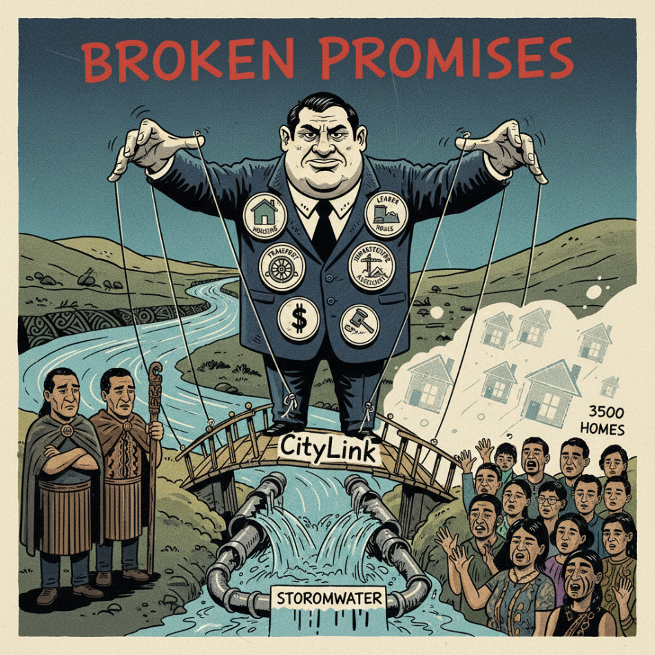 On 17 November 2025, Prime Minister Christopher Luxon endorsed what he called a “pragmatic” decision by Housing and Transport Minister Chris Bishop to reallocate $27 million from infrastructure designed to enable 3,500 new homes in Lower Hutt to fund a cycling bridge that the government itself had cancelled nationwide. The decision reveals three hidden networks that destroy the mauri (life force) of whānau housing, mana whenua partnership, and ministerial accountability in Aotearoa.
