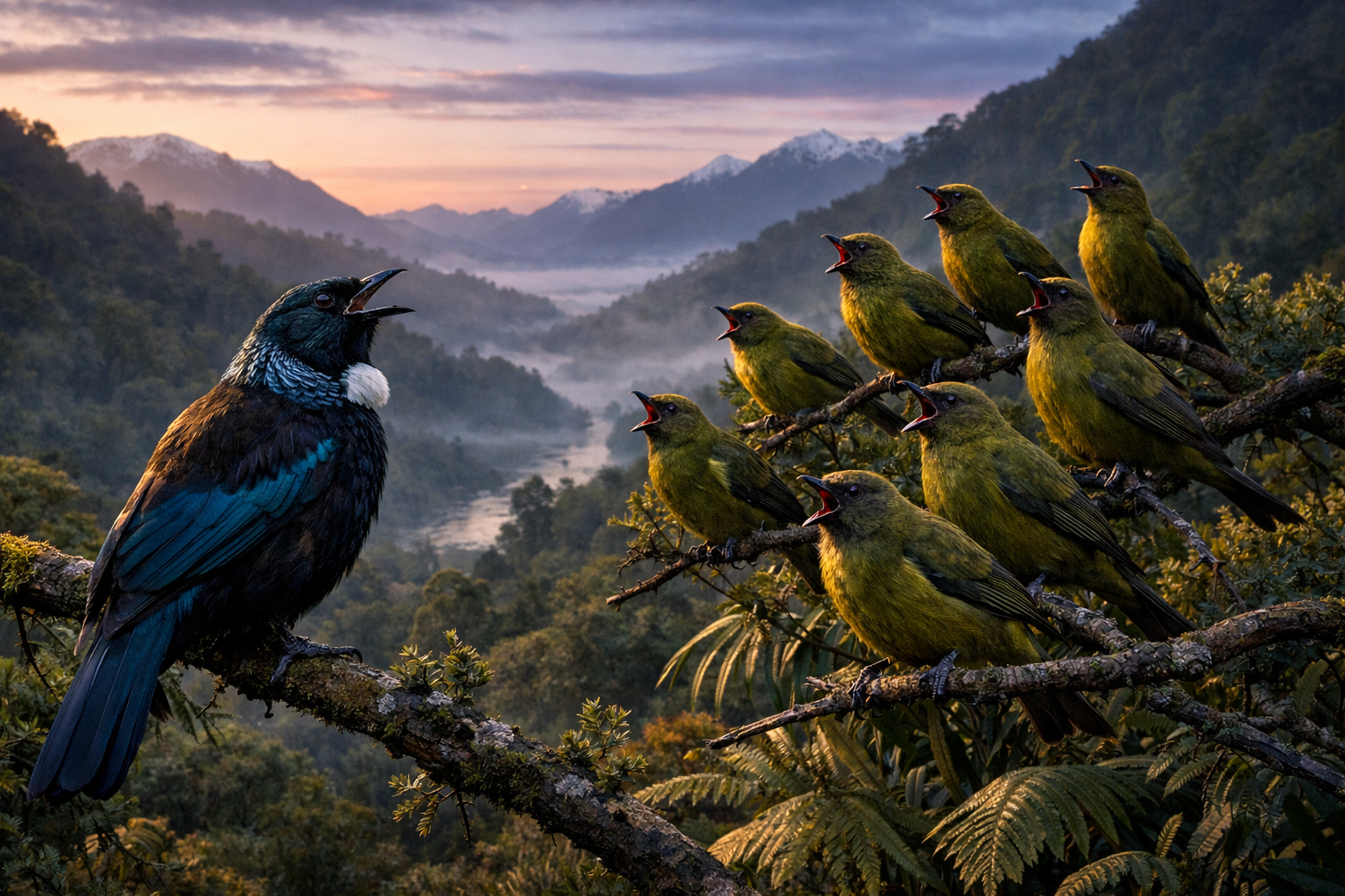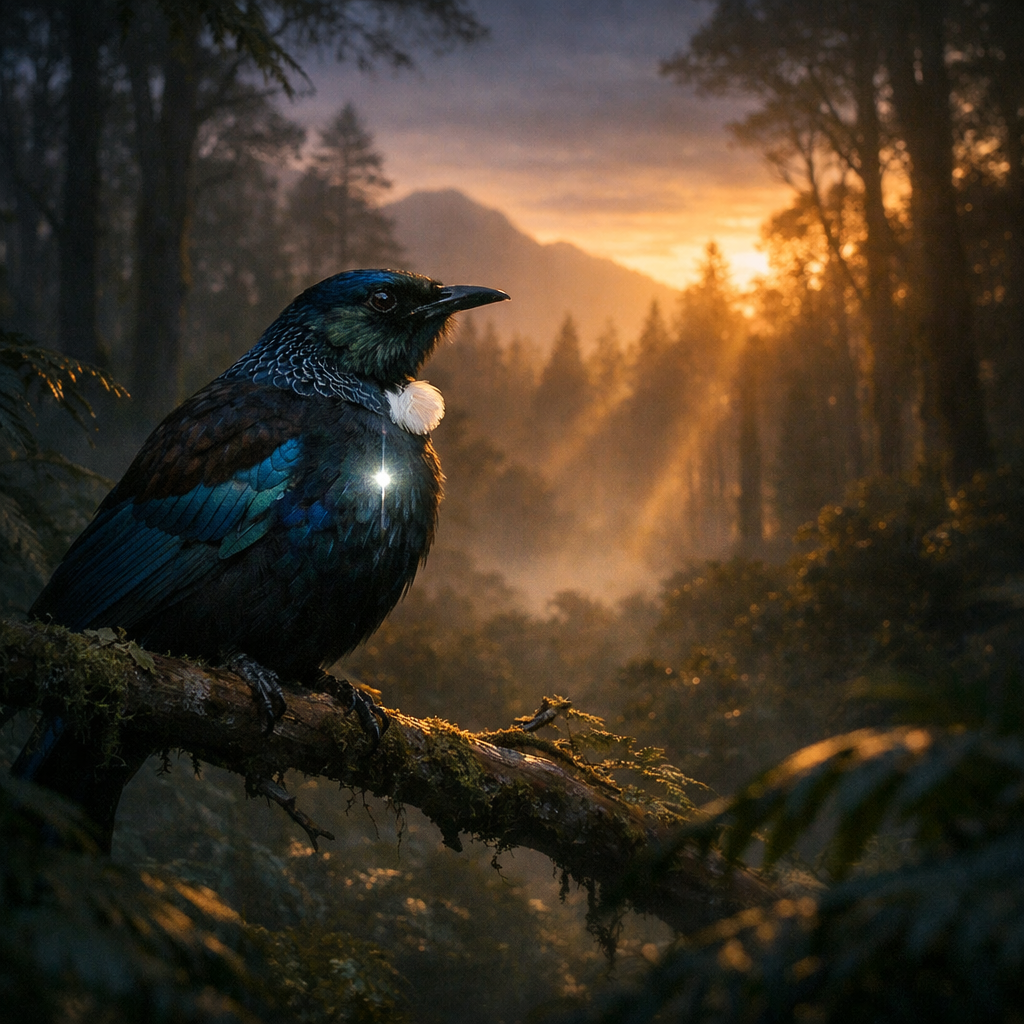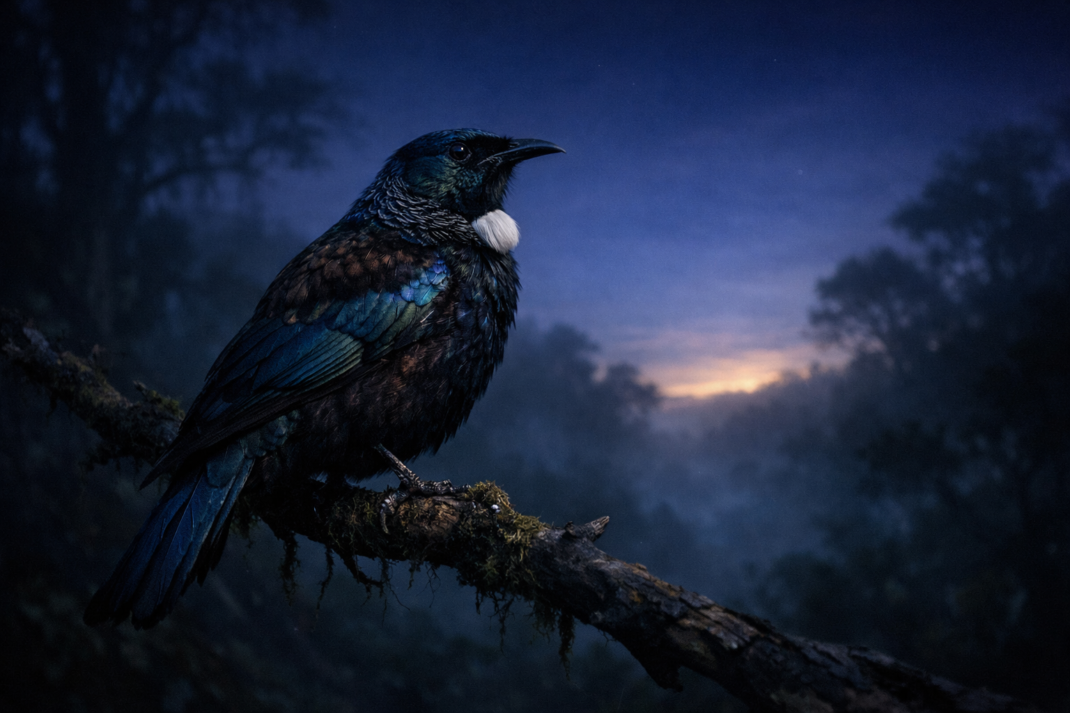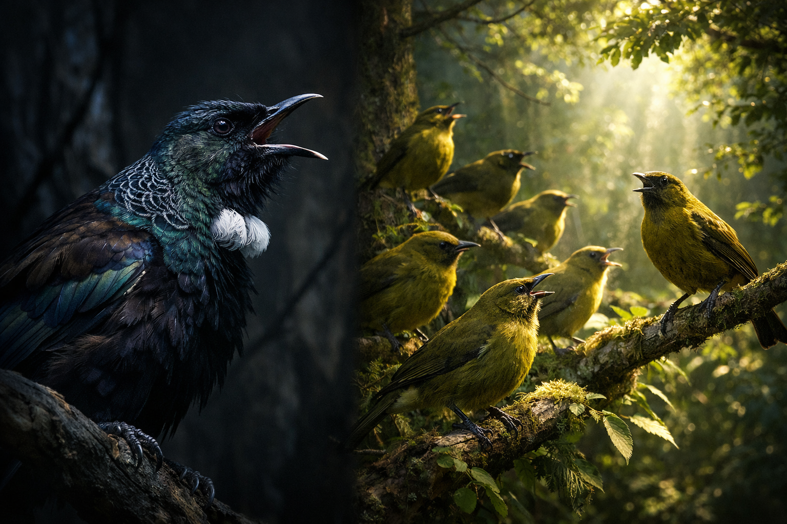 the tūī is the descendant of birds trained for millennia to carry knowledge. The voice that emerges from the forest darkness is carrying whakapapa—the genealogy of truth-telling itself.