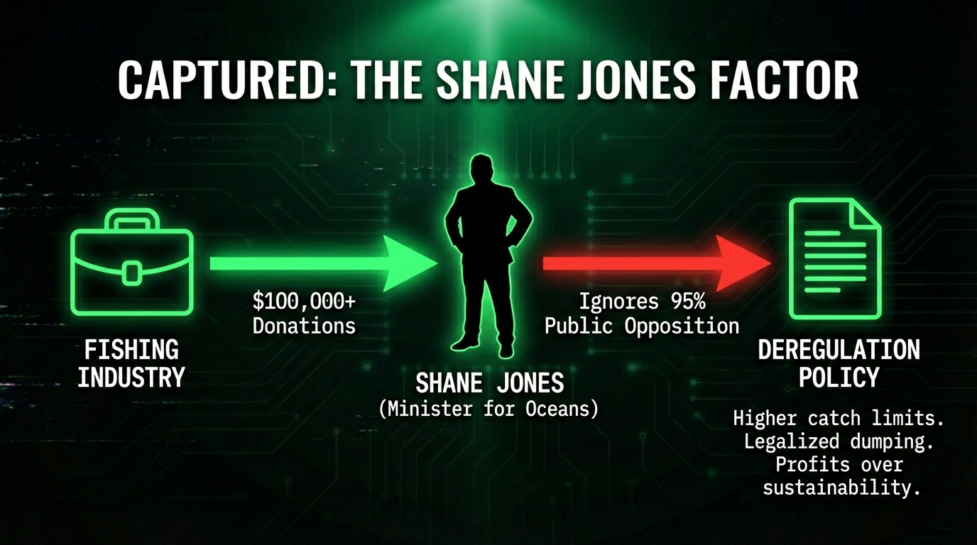Across the Tasman, the same machinery operates in real time. Shane Jones, New Zealand's Minister for Oceans and Fisheries, received over $100,000 in fishing industry donations before announcing the "most significant Fisheries Act reforms in decades"—reforms that allow higher catch limits, exempt camera footage from the Official Information Act, remove the requirement to land all catch (legalising dumping), and restrict who can challenge fisheries decisions in court. 95% of public submissions opposed these reforms. Cabinet approved them anyway.