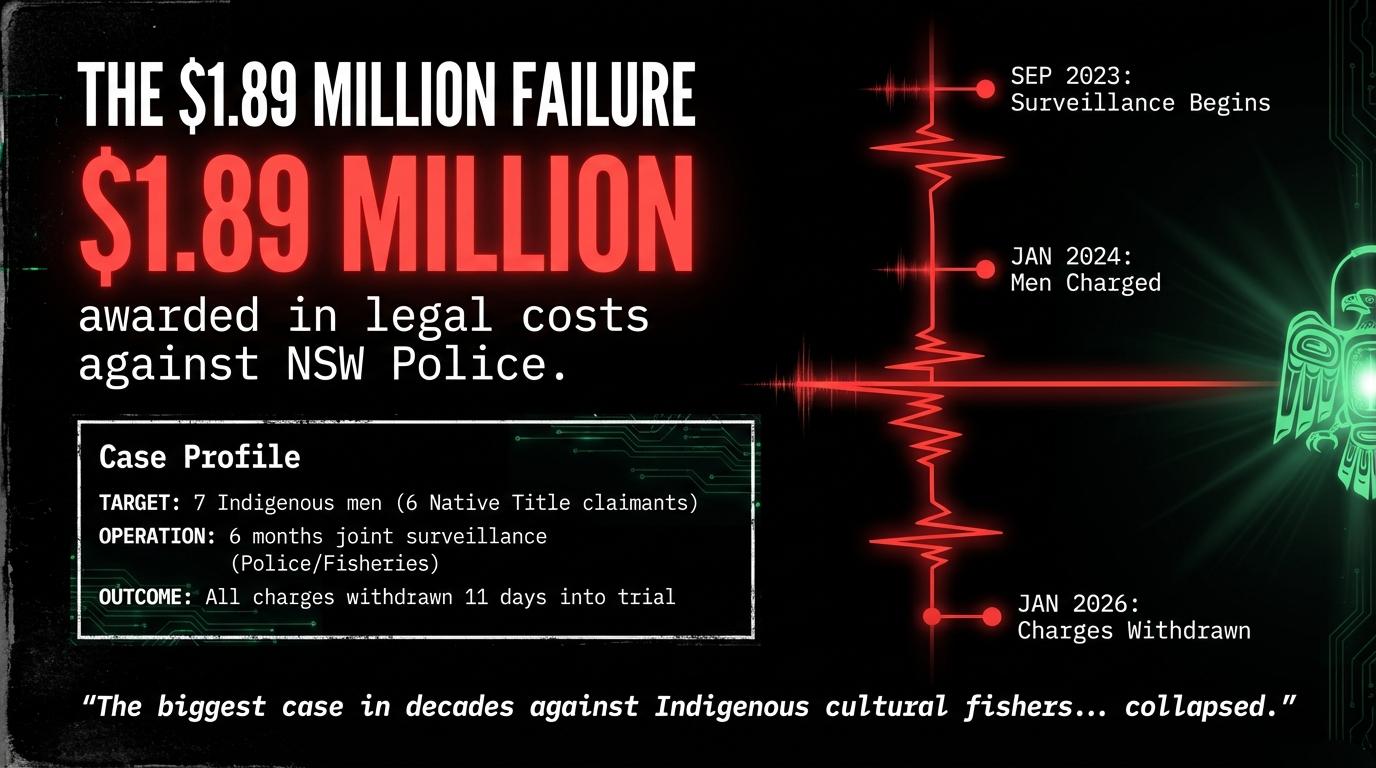 Then, eleven days into the trial at Nowra Court, prosecutors dropped every single charge. NSW Police were ordered to pay $1.89 million in defence costs. Subpoenaed documents revealed that the case had already fallen apart before it even went to trial—prosecutors and fisheries officers knew by March 2024, nearly two years before trial, that critical evidence was inadmissible because it was entangled with confidential native title negotiations. They prosecuted anyway.