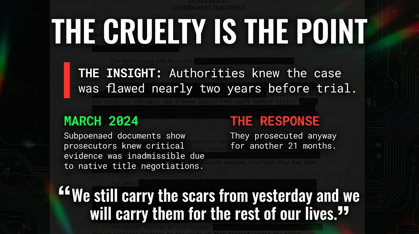 When the state burns $1.89 million prosecuting Aboriginal men for gathering the food their ancestors ate for 65,000 years—then drops every charge—the cruelty is not the failure. The cruelty is the point.