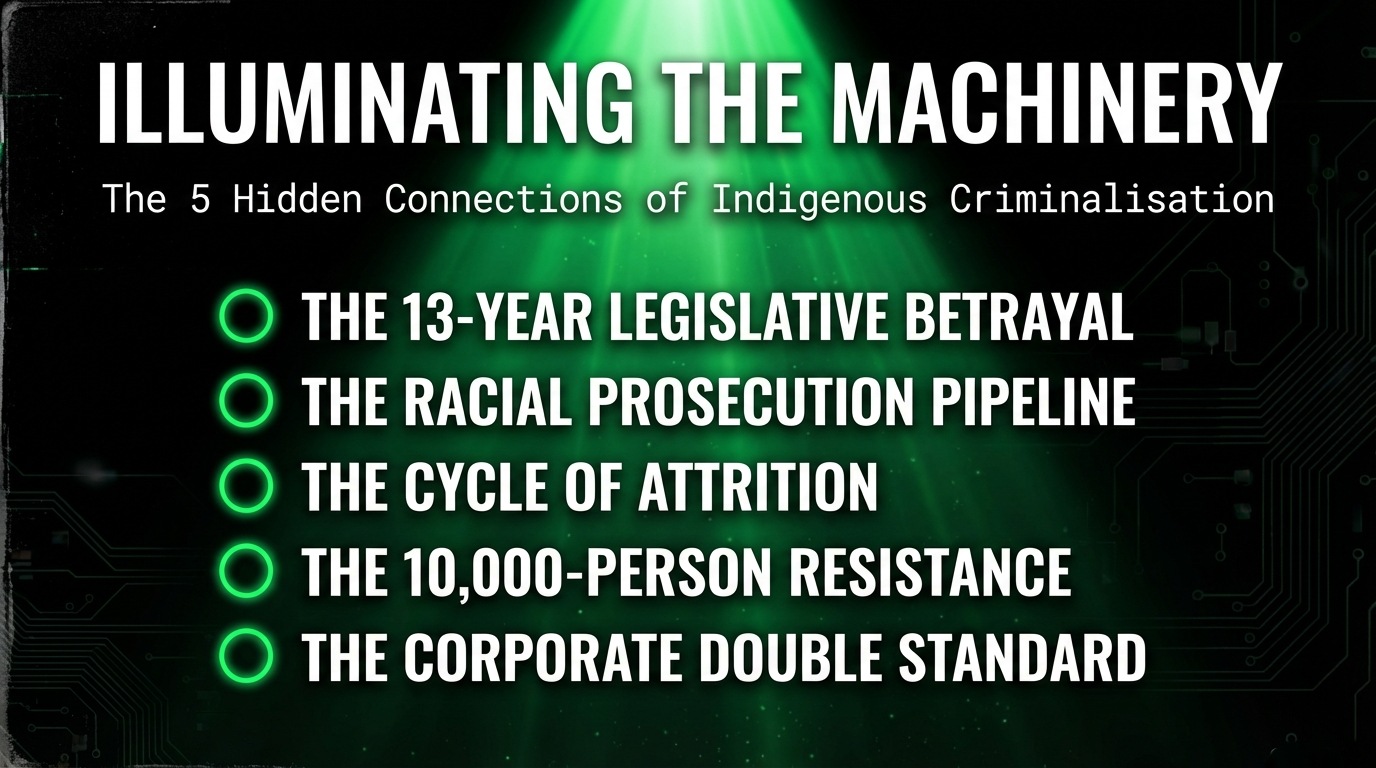 Connection 1: The 13-Year Legislative Betrayal. In 2009, the NSW Parliament passed Section 21AA of the Fisheries Management Act—a provision specifically designed to protect Aboriginal people from prosecution for cultural fishing. Thirteen years later, as a NSW parliamentary inquiry found in 2022, the section had never been commenced. The committee concluded the NSW Government had "failed to implement the will of parliament". The very people the law was supposed to protect continued to be prosecuted under the very framework the law was supposed to dismantle. This is legislative gaslighting at industrial scale.