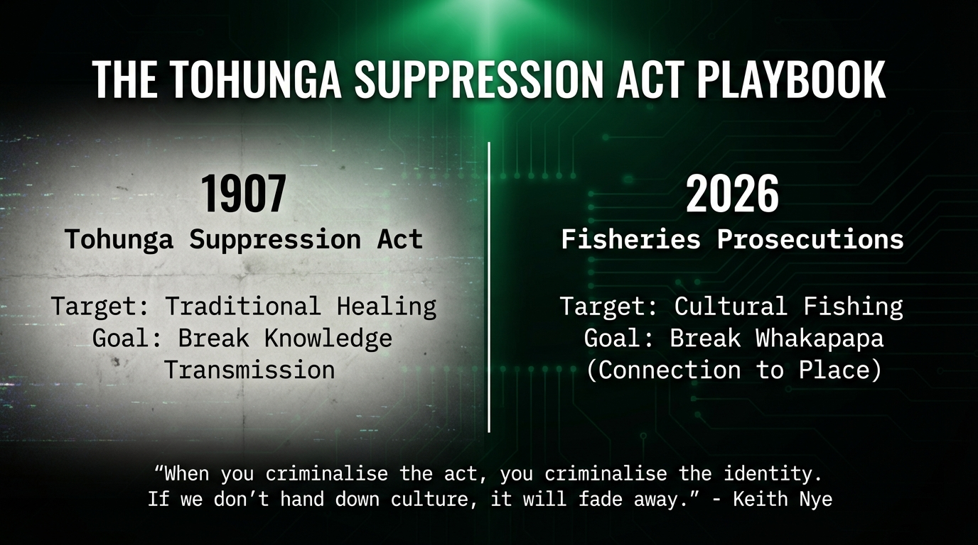 The through-line is unbroken. From the Tohunga Suppression Act 1907 to the Foreshore and Seabed Act 2004, from the Treaty Principles Bill 2024 to Shane Jones' industry-captured fisheries reforms—the settler state criminalises Indigenous cultural practice, then reframes criminalisation as "equal treatment under law."