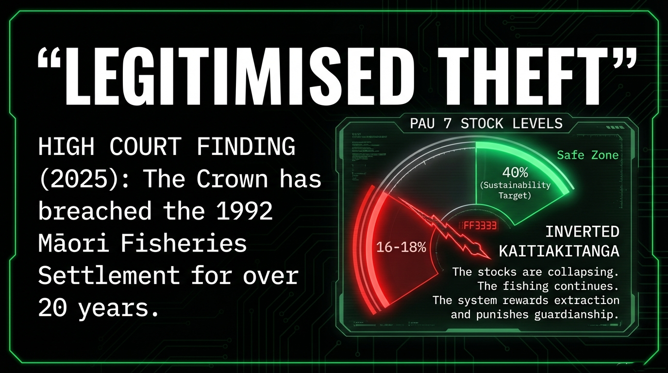 Simultaneously, the High Court found in 2025 that the Crown has been breaching the 1992 Māori Fisheries Settlement for over 20 years by appropriating Māori fishing quota without compensation through the 28N rights mechanism. The Crown made promises. The Crown broke promises. The Crown kept breaking promises for two decades while officials watched.