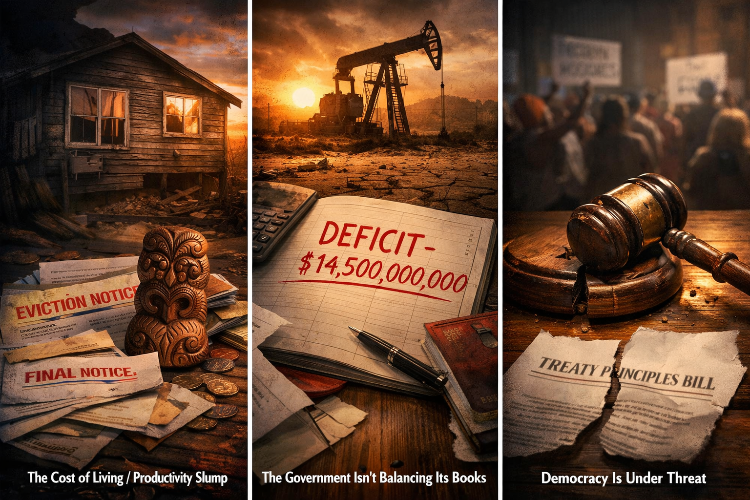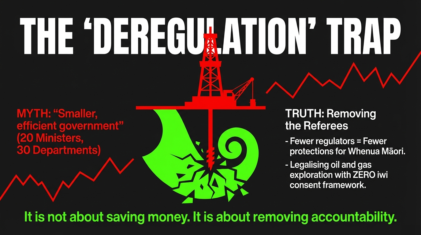 - Environmental extraction: "Legalising looking for oil and gas" on whenua Māori without iwi consent frameworks, combined with deregulation that strips resource management protections, is kaitiakitanga in reverse.