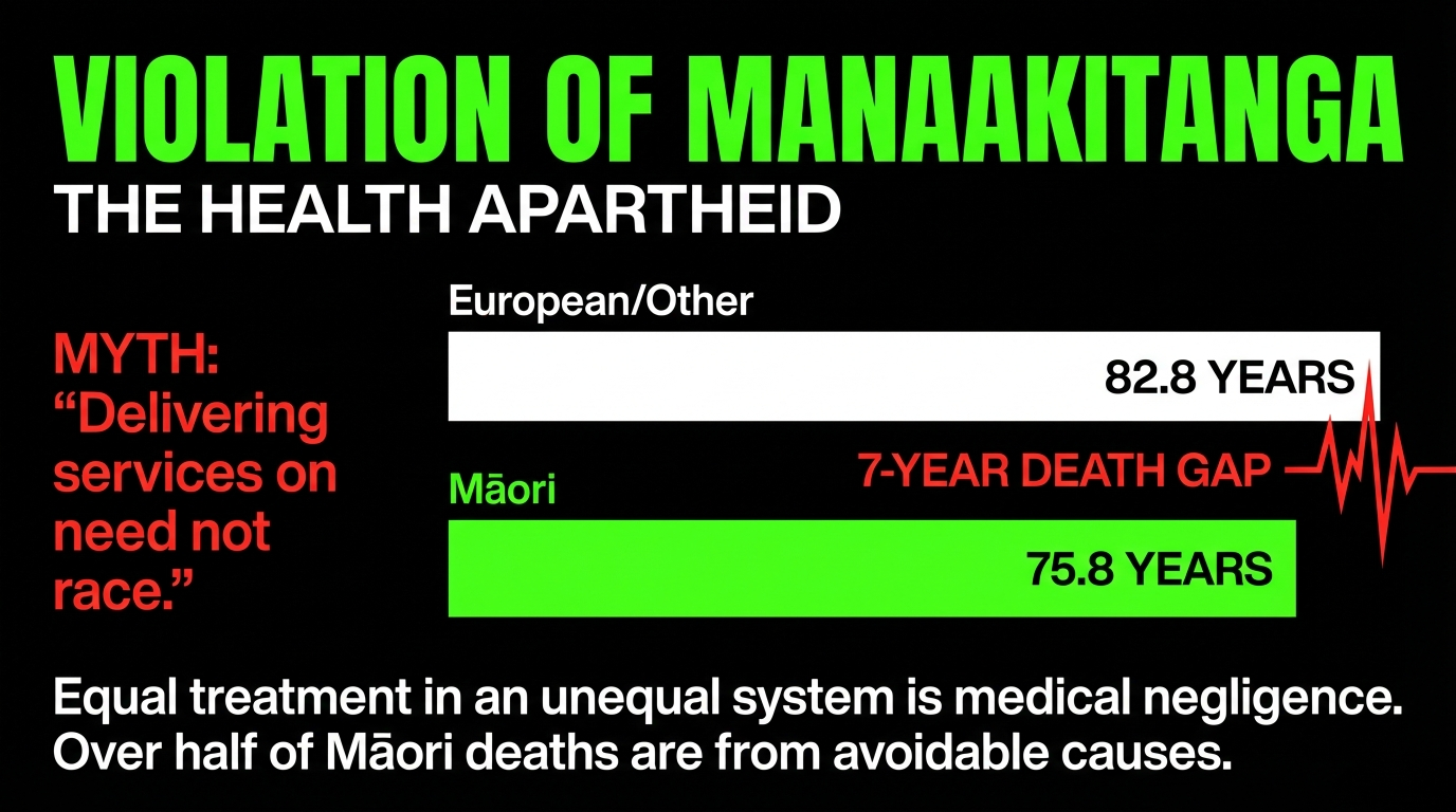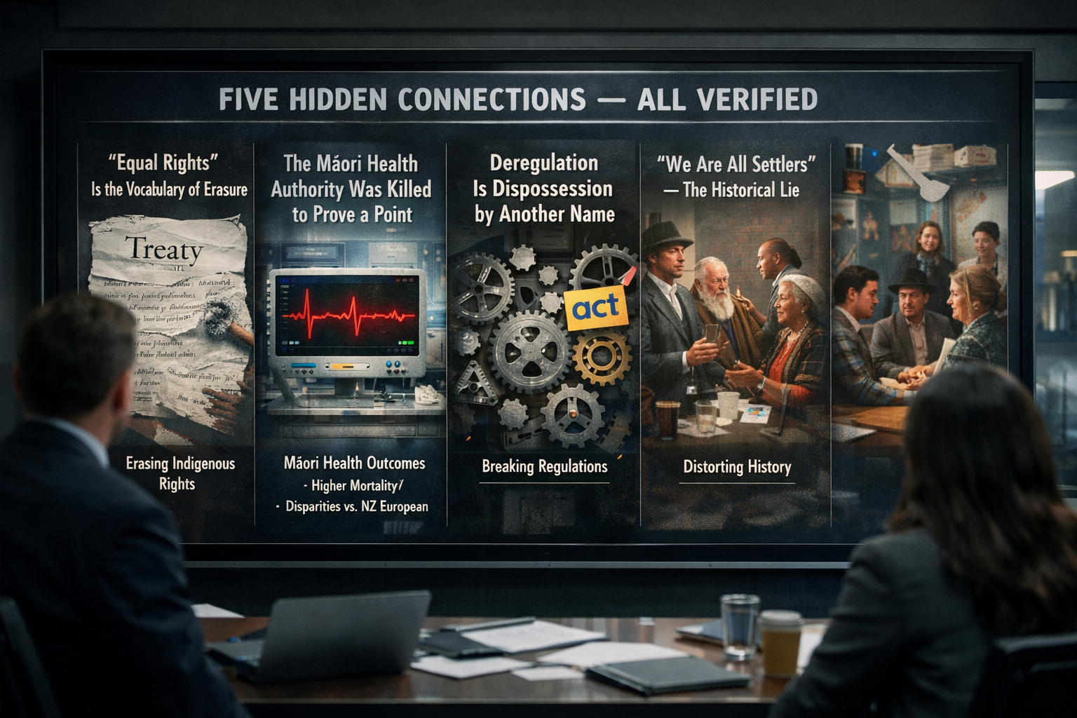 Previously covered by The Māori Green Lantern: The dismantling of health equity was examined in "Back to Basics, Back to Brutality" (13 February 2026), documenting the coordinated legislative assault on Māori rights across health, housing, and democracy; and in "THE ROTTING WAKA" (12 February 2026), exposing how the coalition sold Aotearoa's integrity to the highest bidder.