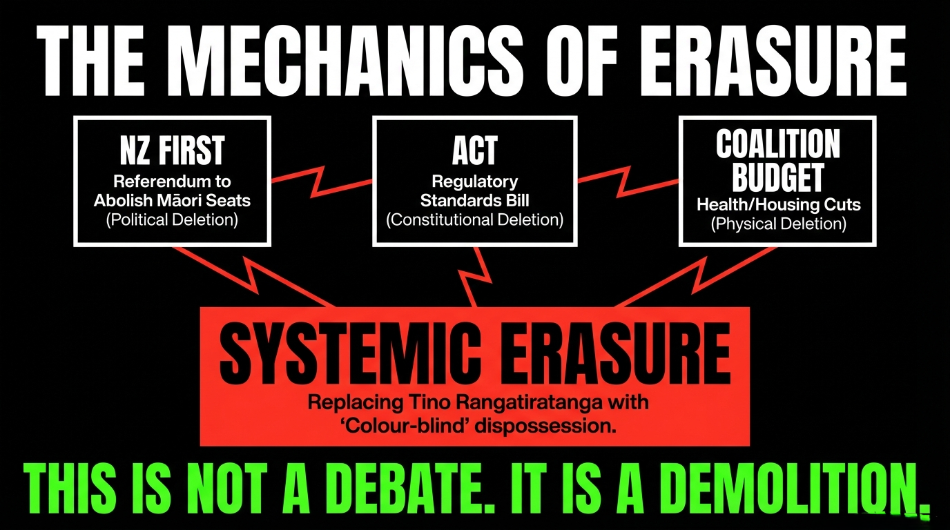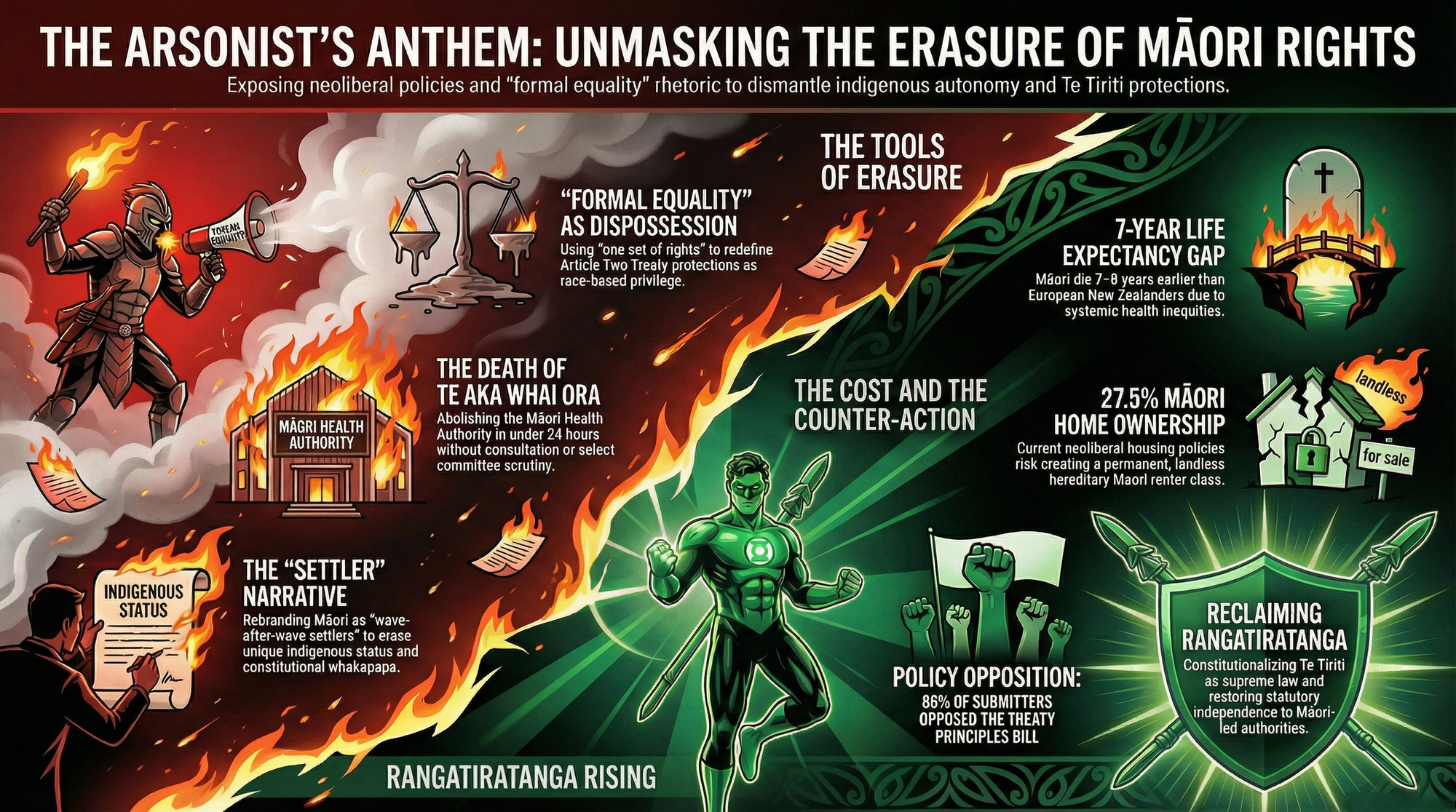 Previously covered by The Māori Green Lantern: The systematic dismantling of rangatiratanga was the subject of "THE WHARE IS ROTTEN: Why Te Pāti Māori Must Decolonise Itself" (Substack, 23 December 2025) — examining how even the party formed to defend rangatiratanga had been captured by neoliberal structures — and "TE KAIWHAKAWĀ PARAU: The Anointing of the Crusher" (Ghost, 14 February 2026), exposing the judicial dimension of the coalition's constitutional assault.