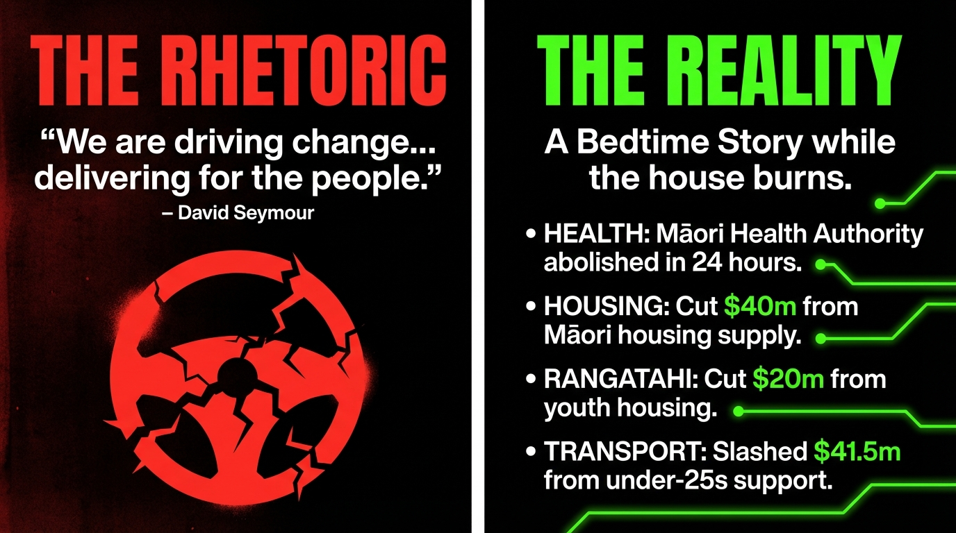 On 15 February 2026, Deputy Prime Minister David Seymour stood before 200 ACT Party faithful in Christchurch and delivered what RNZ called a "State of the Nation" speech. Outside, Free Palestine protestors gathered with police. Inside, something far more dangerous than a protest was unfolding: a forty-three-minute masterclass in the art of making dispossession sound like liberation.