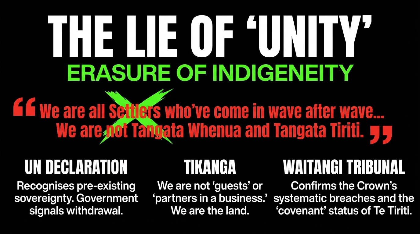 To call Māori "settlers" is to commit historical violence. It erases the Treaty signing, the land confiscations, the musket wars, the Tohunga Suppression Act, the Native Schools Act, the decades of Waitangi Tribunal findings documenting systematic Crown breaches. It rewrites 184 years of constitutional law with a bumper sticker.