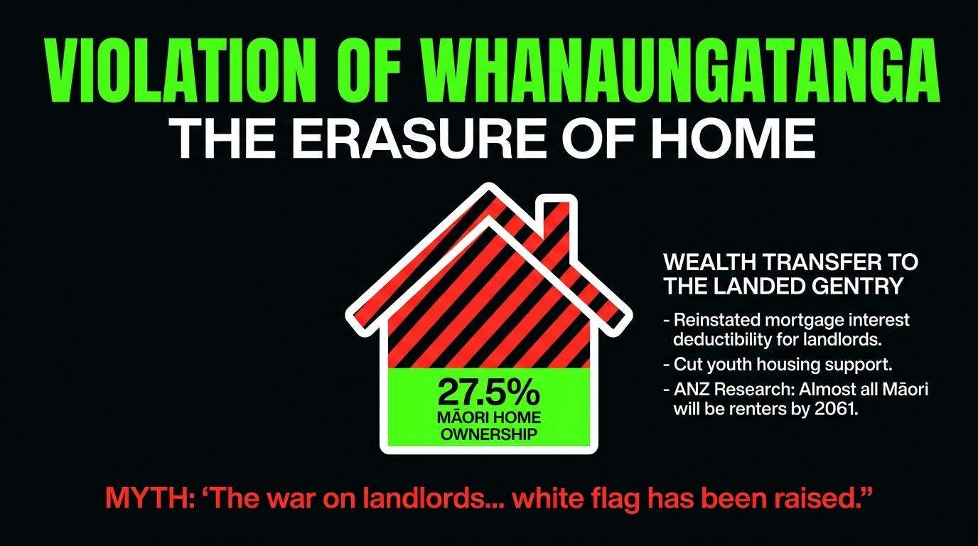 Previously covered by The Māori Green Lantern: The erasure of Māori identity through neoliberal "unity" narratives was dissected in "How Labour and the Greens Turned Te Tiriti into a Backdrop" (Substack, 2 February 2026), and the housing crisis was quantified in "THE ARSONIST'S AUDIT" (Ghost, 12 February 2026), exposing the transfer of wealth to the "landed gentry" and the devastation of Māori homeownership.