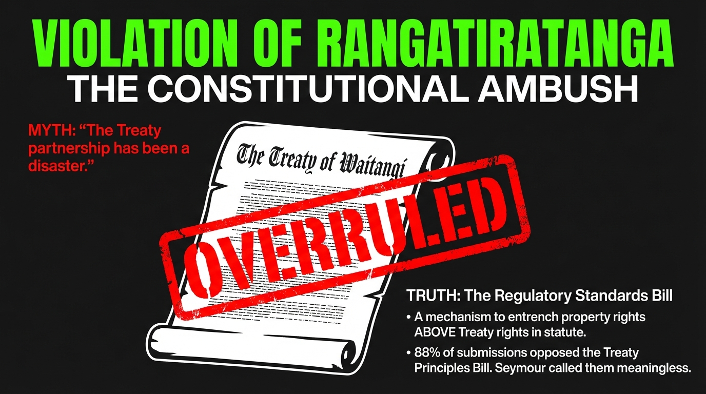 Fewer departments means fewer Treaty obligations. Fewer regulators means fewer environmental protections on whenua Māori. The Regulatory Standards Bill — which Seymour champions — would, for the first time in New Zealand history, entrench property rights in statute. It would create a Regulatory Standards Board, appointed by the Minister for Regulation (Seymour himself), with the power to review all legislation against neoliberal "principles."