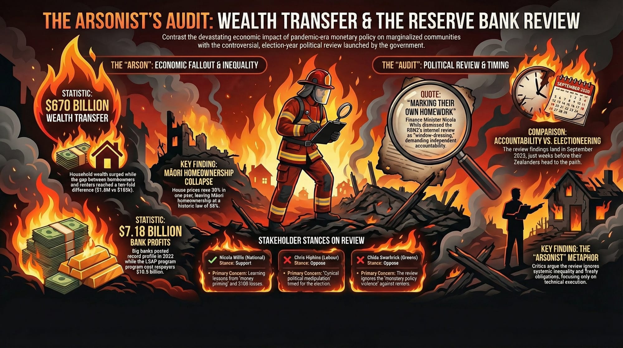 They burned $55 billion and called it monetary policy. They transferred a trillion dollars to the landed gentry and called it "keeping the economy functioning." They devastated Māori homeownership — 28 percent and falling — and now they want a "review" timed for election season.