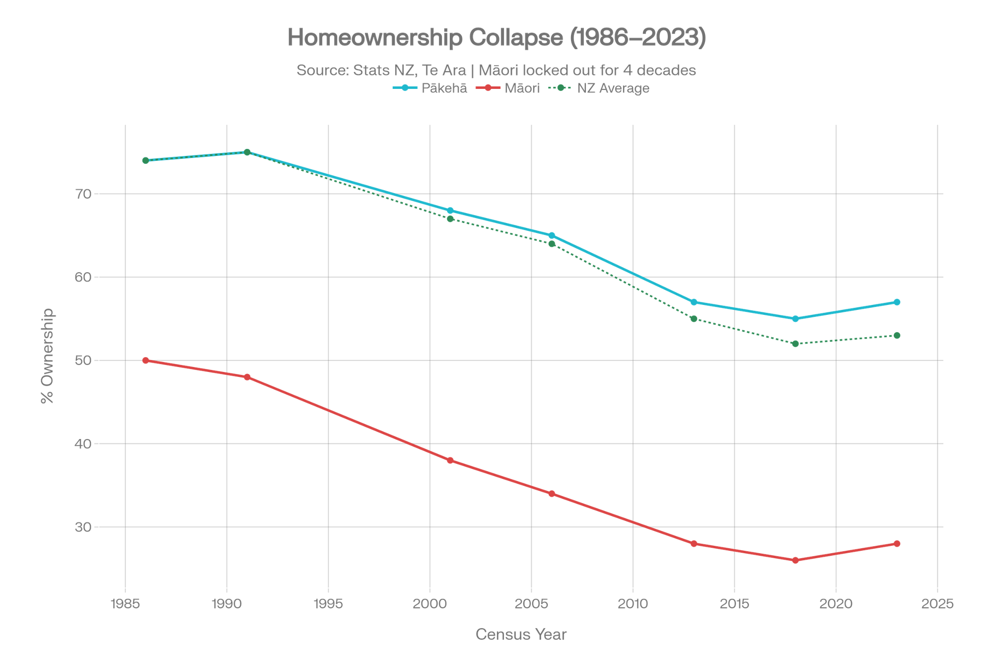 Māori homeownership has been in freefall for four decades. In 1926, nearly 70 percent of Māori households owned their own homes, as documented by Te Ara. By 1986, it was below 50 percent. By 2013, it had crashed to 28 percent, compared with 57 percent for Pākehā, as confirmed by Te Ara.