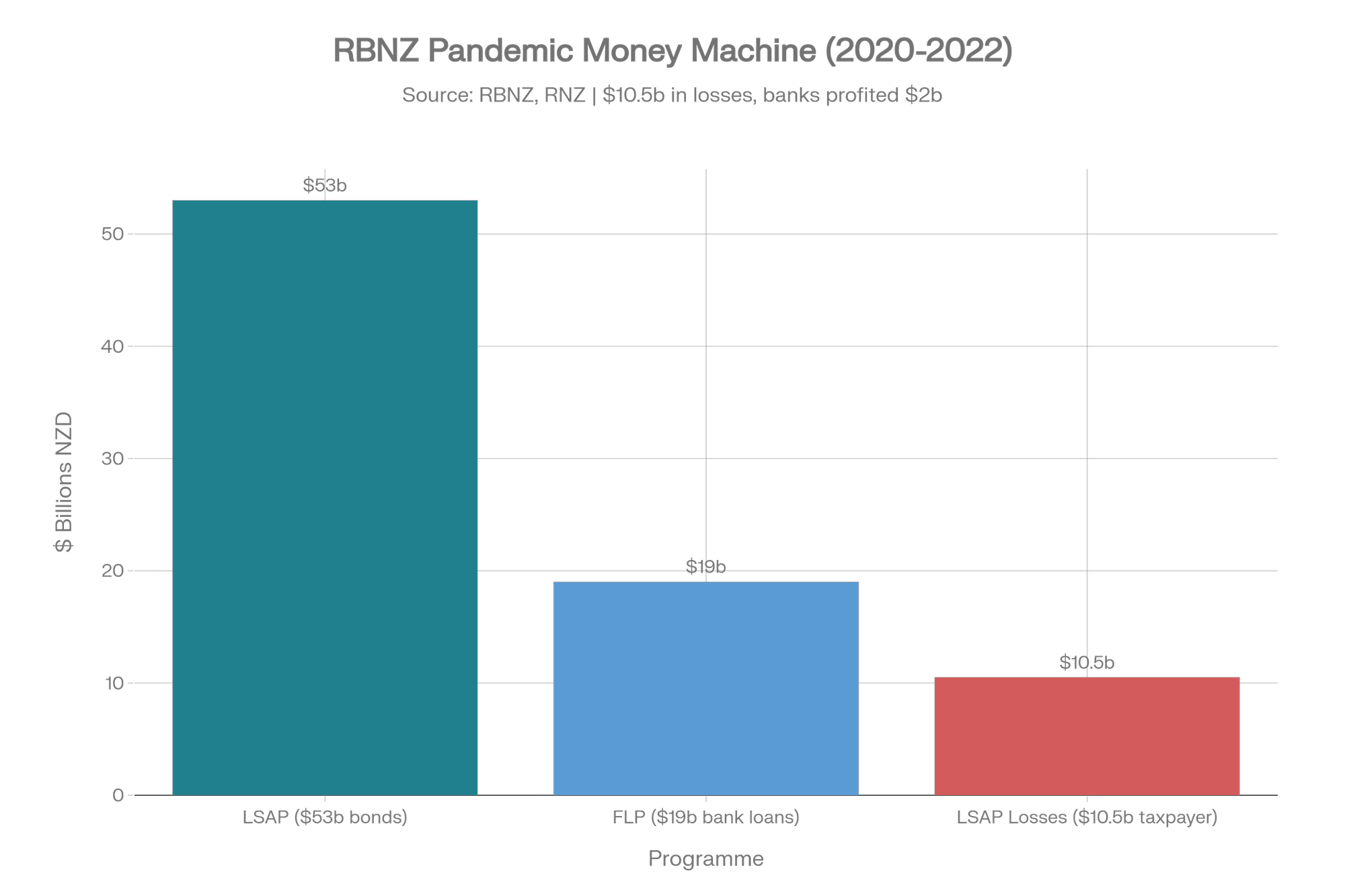 They launched the Large Scale Asset Purchase programme (LSAP) — buying approximately $53 billion worth of government bonds from private investors, as confirmed by RBNZ chief economist Paul Conway. This was, in plain English, money printing. It injected liquidity into financial markets, drove down long-term interest rates, and sent asset prices — particularly house prices — into orbit.