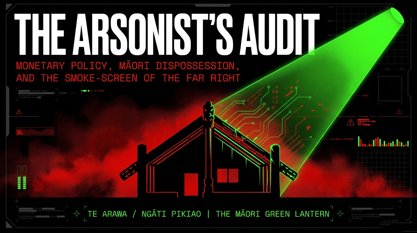 The whare is in ashes. The arsonists are conducting the audit. The man who delivered the Orewa speech endorses the findings in advance. The Finance Minister who forced out the governor now reviews the institution she captured. The banks count their billions. And whānau Māori — median net worth $52,000, homeownership at 28 percent, five times more likely to be homeless — are told to wait for a report in September.
