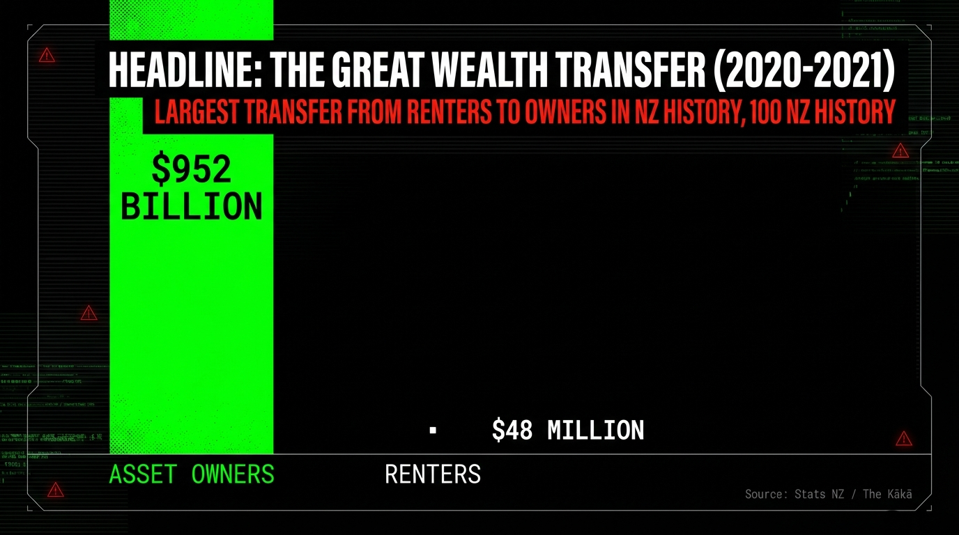 The flames lick $53 billion into the sky. The heat drives house prices up 30 percent in a single year, as confirmed by RNZ. The smoke chokes everyone — but the people locked outside, the ones with no fire insurance, no equity, no generational wealth — they suffocate first.