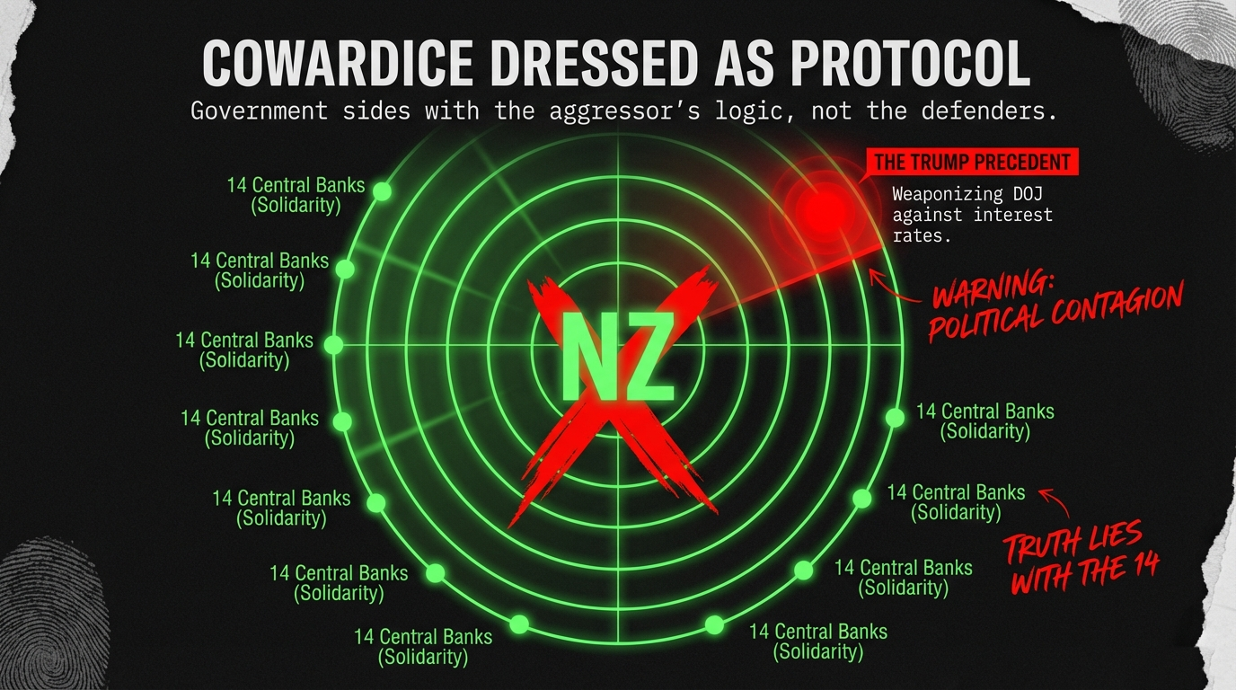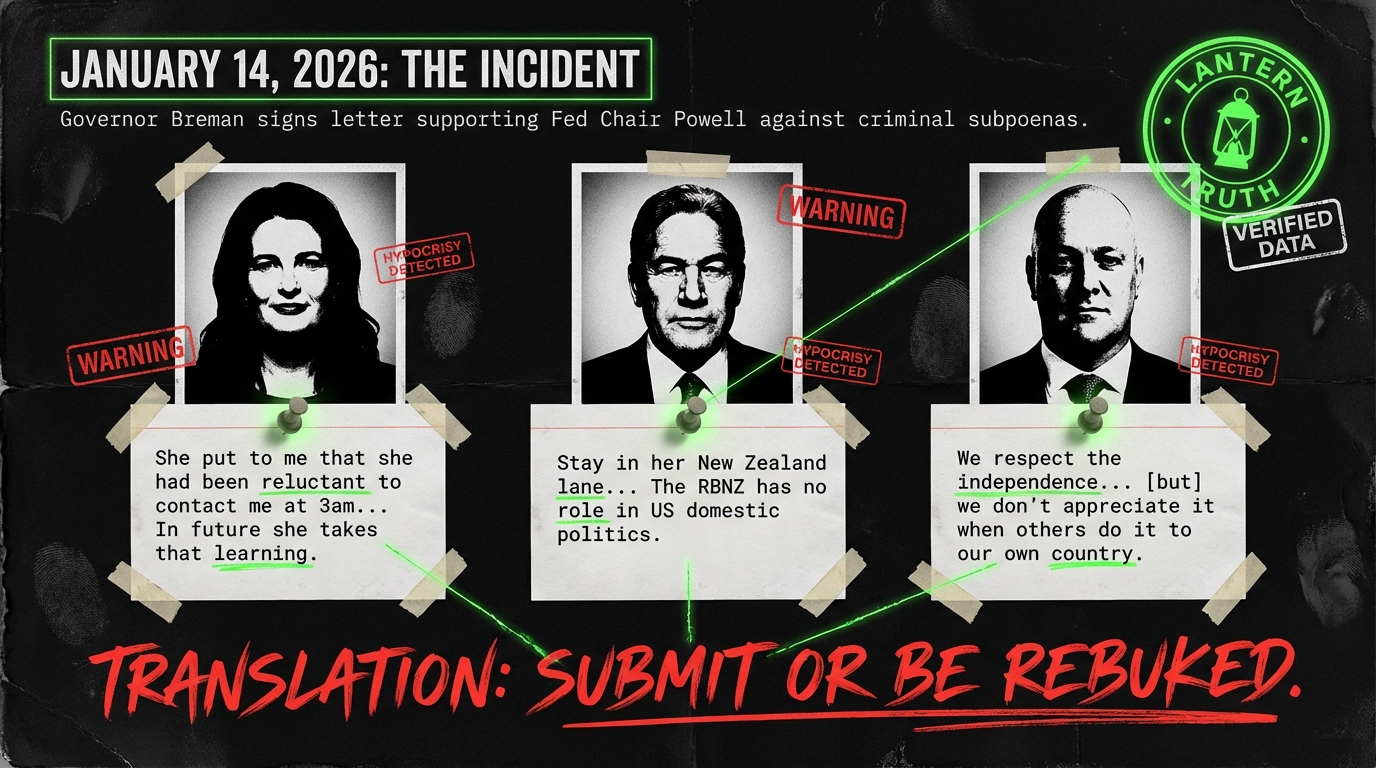 On Monday, January 19, 2026—following Prime Minister Christopher Luxon’s State of the Nation speech—the triumvirate of authoritarian mediocrity assembled to scold Reserve Bank Governor Anna Breman for her January 14 decision to co-sign an international letter defending Federal Reserve Chair Jerome Powell against Trump administration subpoenas.
