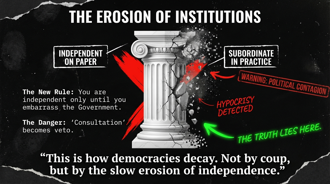 This is how democracies decay. Not through constitutional crisis or military coup, but through the slow erosion of institutional independence by politicians who claim to respect it while systematically undermining anyone who defends it.