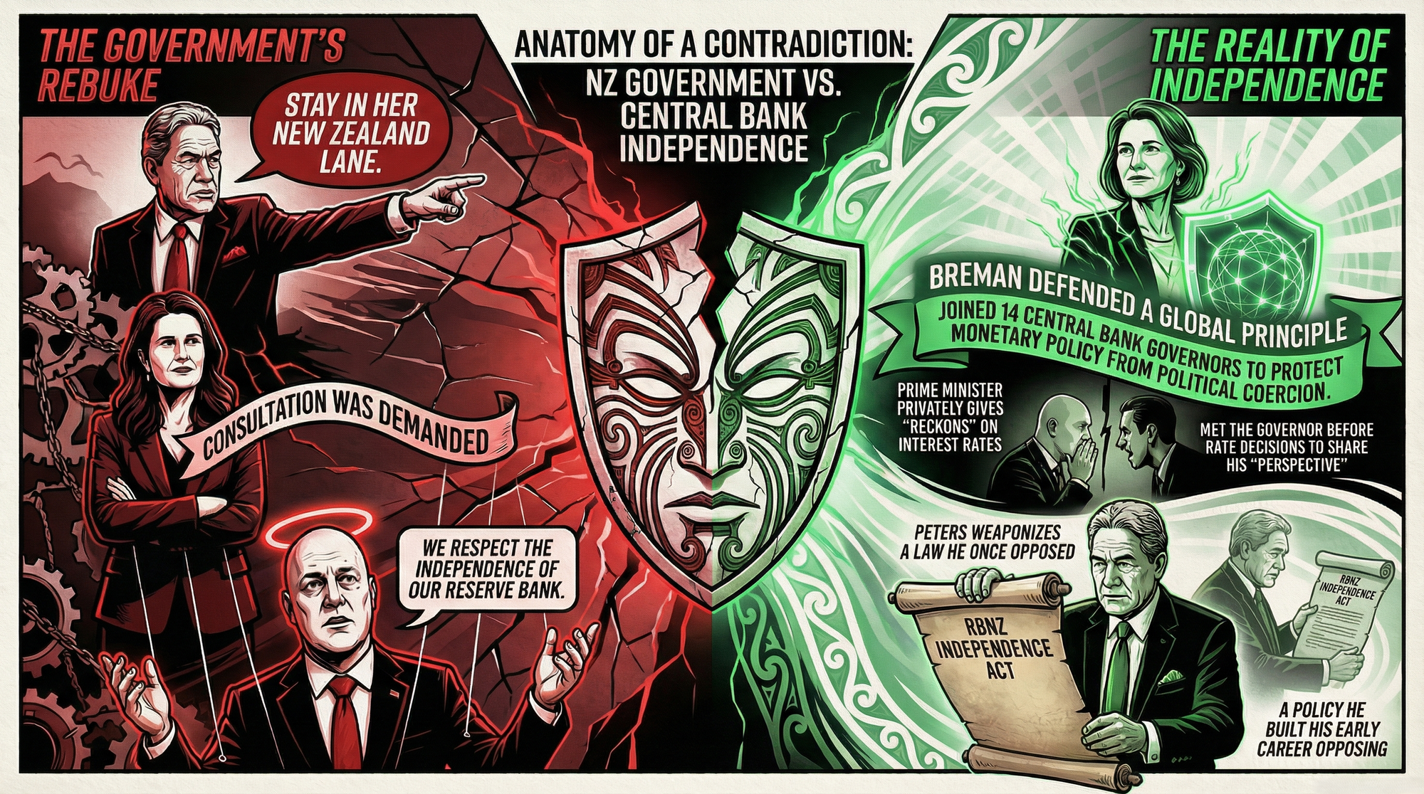 Winston Peters’ demand that Breman “stay in her lane” is an act of such staggering hypocrisy that it defies parody. Peters is weaponizing the very central bank independence doctrine he signed up to enforce in 1996—and then abandoned every principle he had campaigned on to do so.