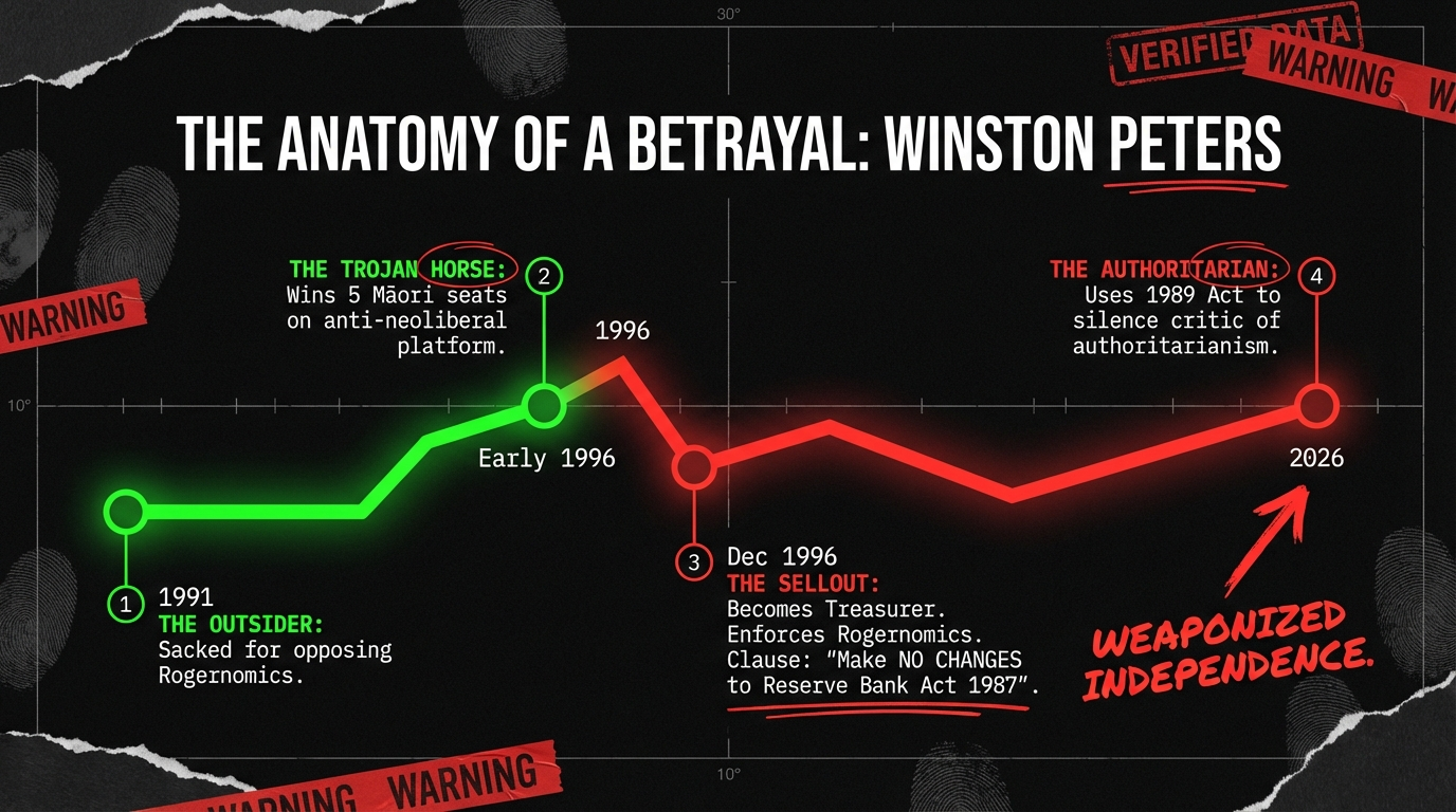 This essay documents institutional betrayal that Crown agencies will not investigate and corporate media will not name: Winston Peters weaponizes central bank independence he signed onto in 1996 to silence a Governor defending those principles in 2026. Christopher Luxon claims to respect Reserve Bank independence while telling Acting Governors where he wants interest rates—interference that influences job applications. Nicola Willis demands Ministerial permission before Breman can defend institutional principles.
