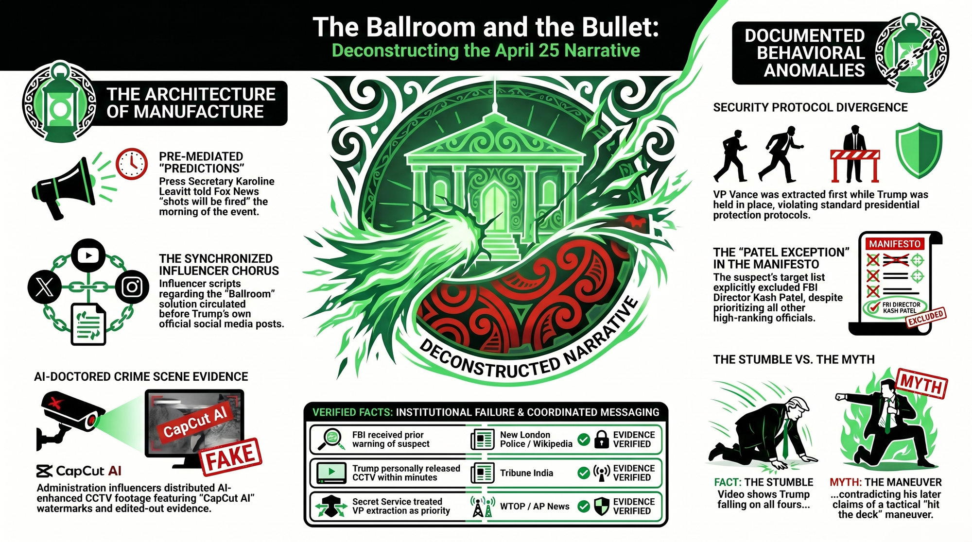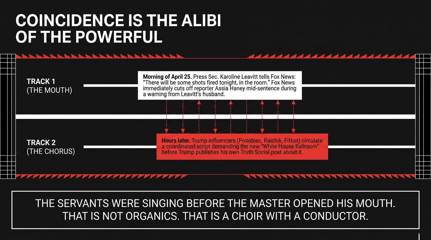 This is what happened on April 25, 2026. As documented by Valhalla VFT's forensic breakdown, the influencer ballroom script was circulating before Trump's own Truth Social post about the ballroom was published.