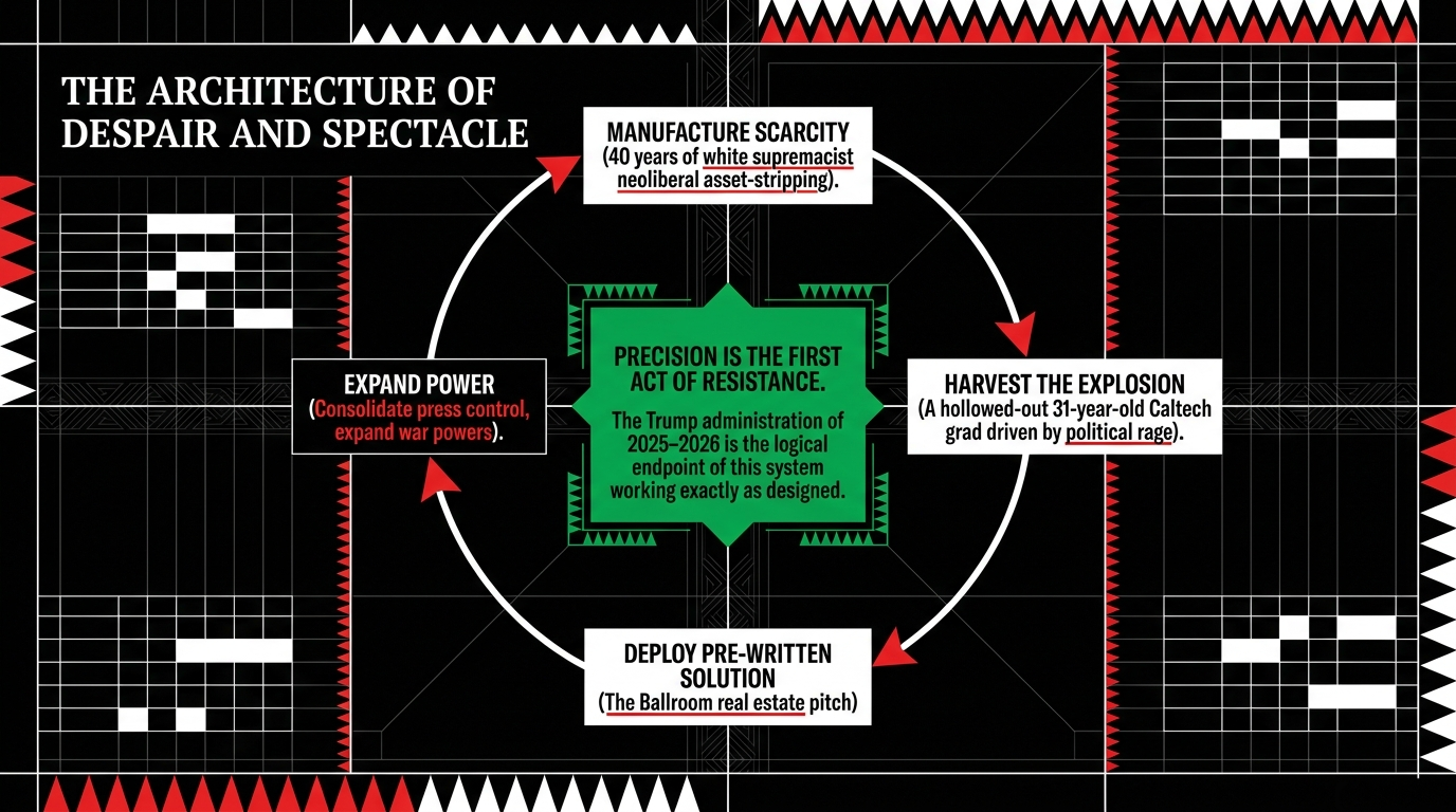 This is what white supremacist neoliberalism produces: a country so hollowed out by decades of manufactured scarcity, wage suppression, and democratic capture that a 31-year-old Caltech engineering graduate with a master's degree and a Teacher of the Month award buys a train ticket to Washington with a shotgun in his bag.