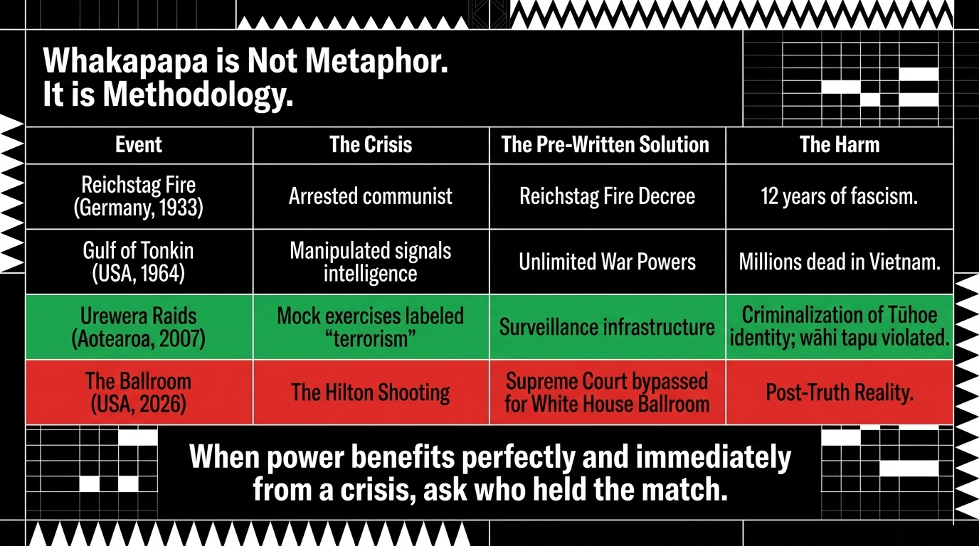 The 2007 Urewera Raids — documented extensively by the Waitangi Tribunal and Māori legal scholars — showed us what state-manufactured threat looks like from the community's side: helicopters over Ruatoki, children photographed at gunpoint, a community criminalised by surveillance theatre. The Māori Green Lantern has covered this whakapapa of state violence in multiple essays. Read The File They Prayed Would Die for the most recent analysis.