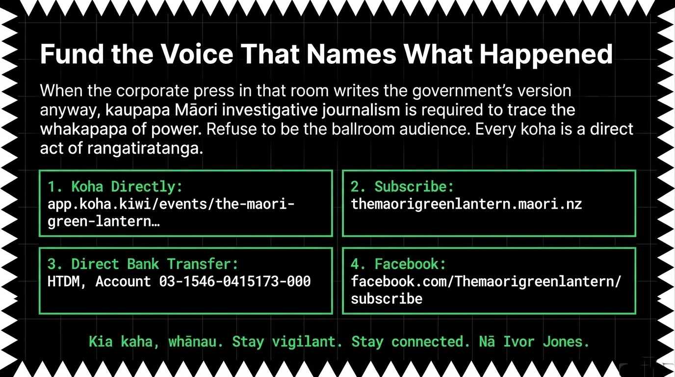 Every koha to the Māori Green Lantern is a direct act of rangatiratanga. It signals that whānau understand the difference between a media apparatus that was in that room and still writes the government's version