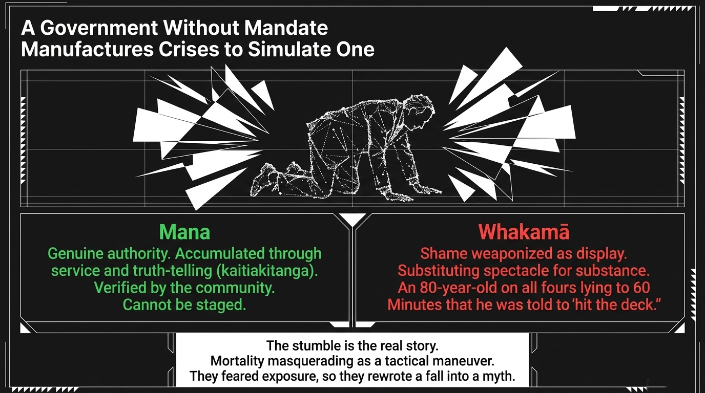 In tikanga, we call the corruption of mana through performance whakamā — shame that has been weaponised as display. A person without genuine mana performs it loudly. A government without genuine mandate manufactures crises to simulate one.