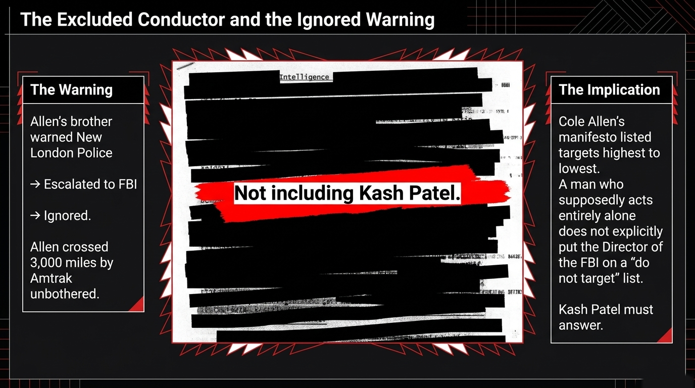 The manifesto attributed to Cole Allen — confirmed as circulating among federal investigators — contains one detail that has received insufficient scrutiny. As Valhalla VFT's transcript analysis reveals, Allen's stated rules of engagement list administration officials as targets "prioritized from highest ranking to lowest" — with one explicit exception: "Not including Kash Patel."