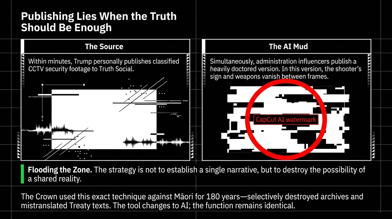 This is the classic Trumpian information strategy — not to establish a single narrative, but to destroy the very possibility of a shared reality. When people cannot agree on what they saw, they cannot organise against what happened.