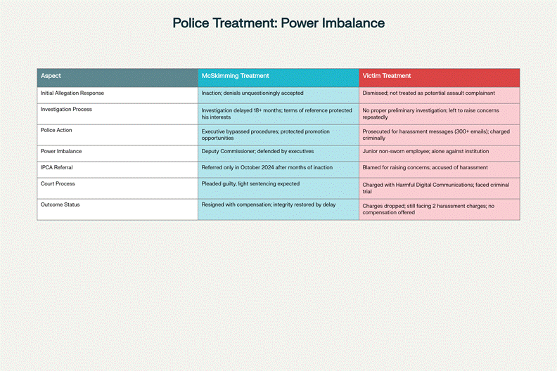By contrast, the accountability Aotearoa Police’s leadership lacked for cover-up, obstruction, and protection of a predatory executive was structural—it would have required dismantling hierarchies, admitting institutional corruption, and relinquishing power. It did not happen. Instead, the victim was prosecuted.[7]