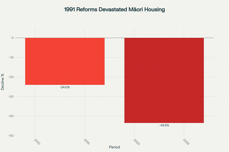 The 1991 neoliberal reforms triggered a catastrophic collapse in Māori home ownership, declining 43.5 percentage points from the 1991 baseline as housing was privatized and market rents imposed.